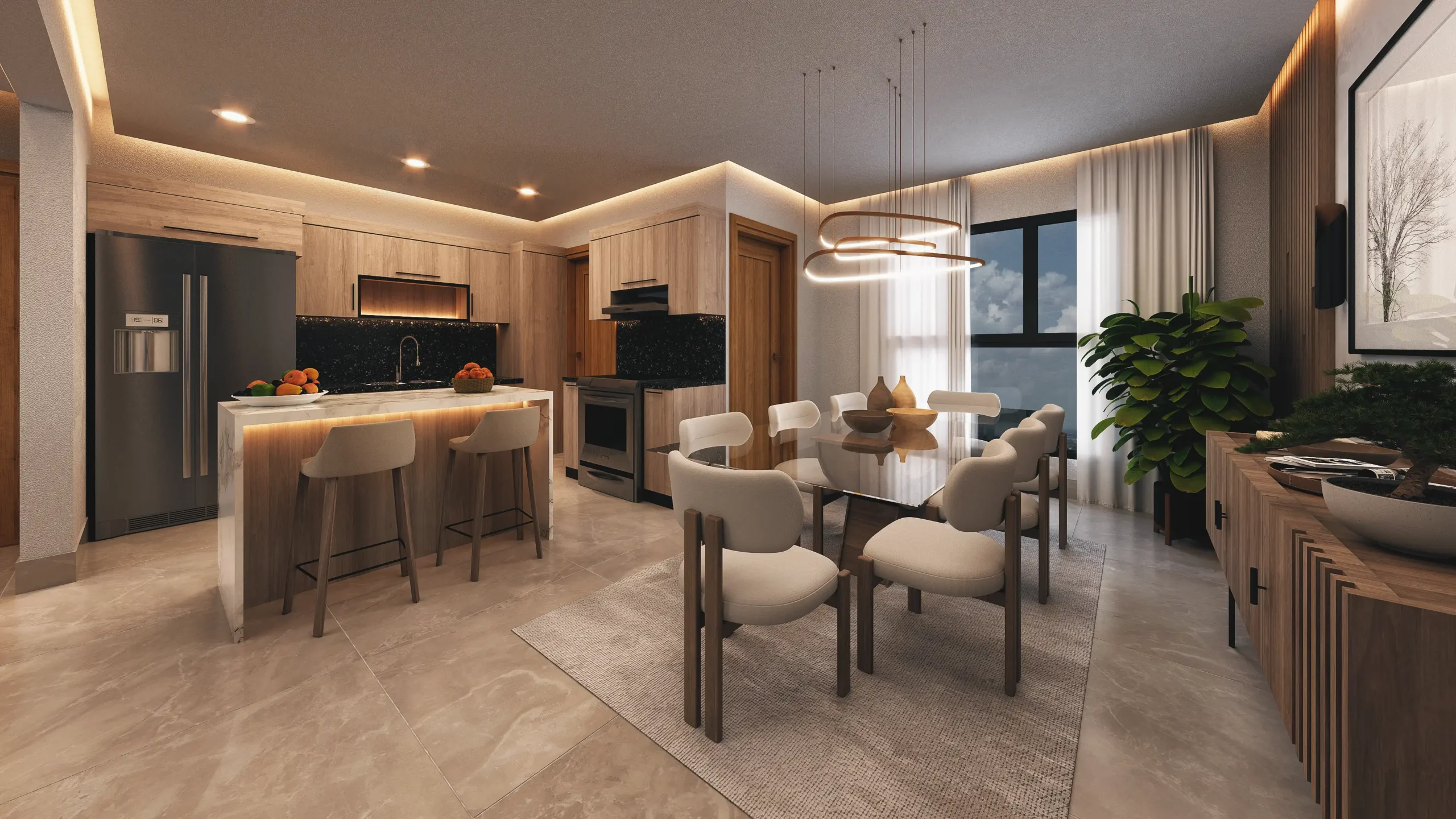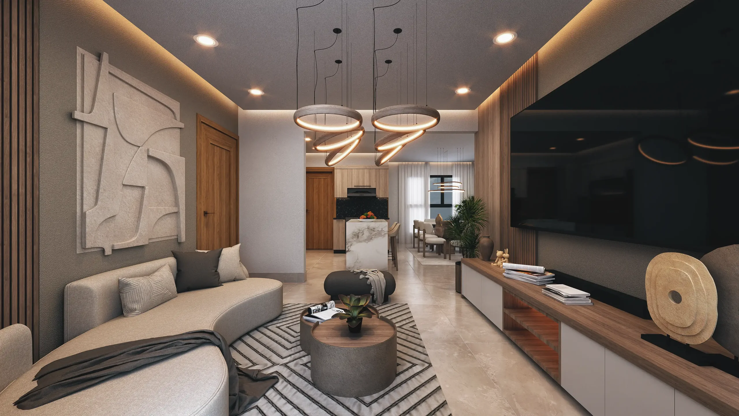 Los apartamentos de Vivalty Luxury Tower han sido diseñados bajo un concepto moderno de espacios integrados, donde la sala, el comedor y la cocina conviven en perfecta armonía, creando un ambiente amplio, luminoso y sofisticado.